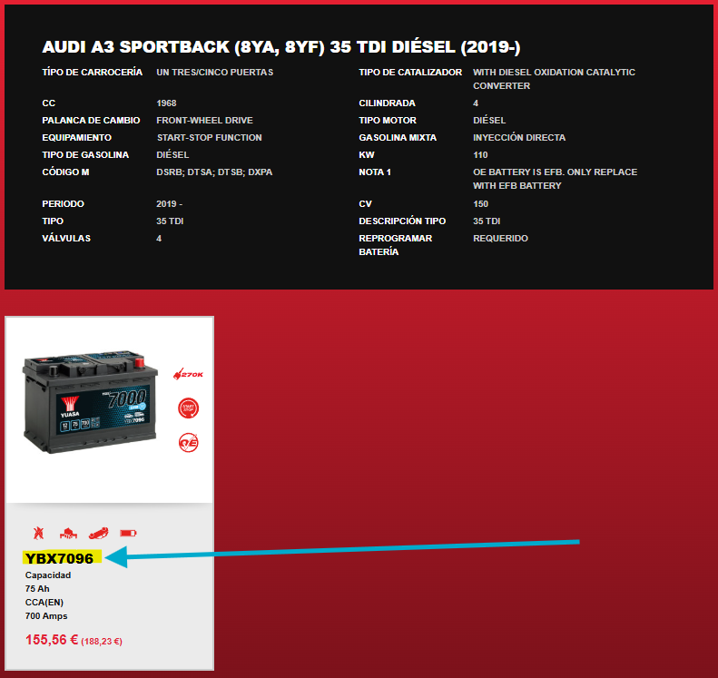 Yuasa es uno de los fabricantes de baterías más importantes del mundo y proveedor original de muchas marcas de coches. Su buscador es extremadamente preciso porque tienen acceso a las bases de datos oficiales de los fabricantes.
